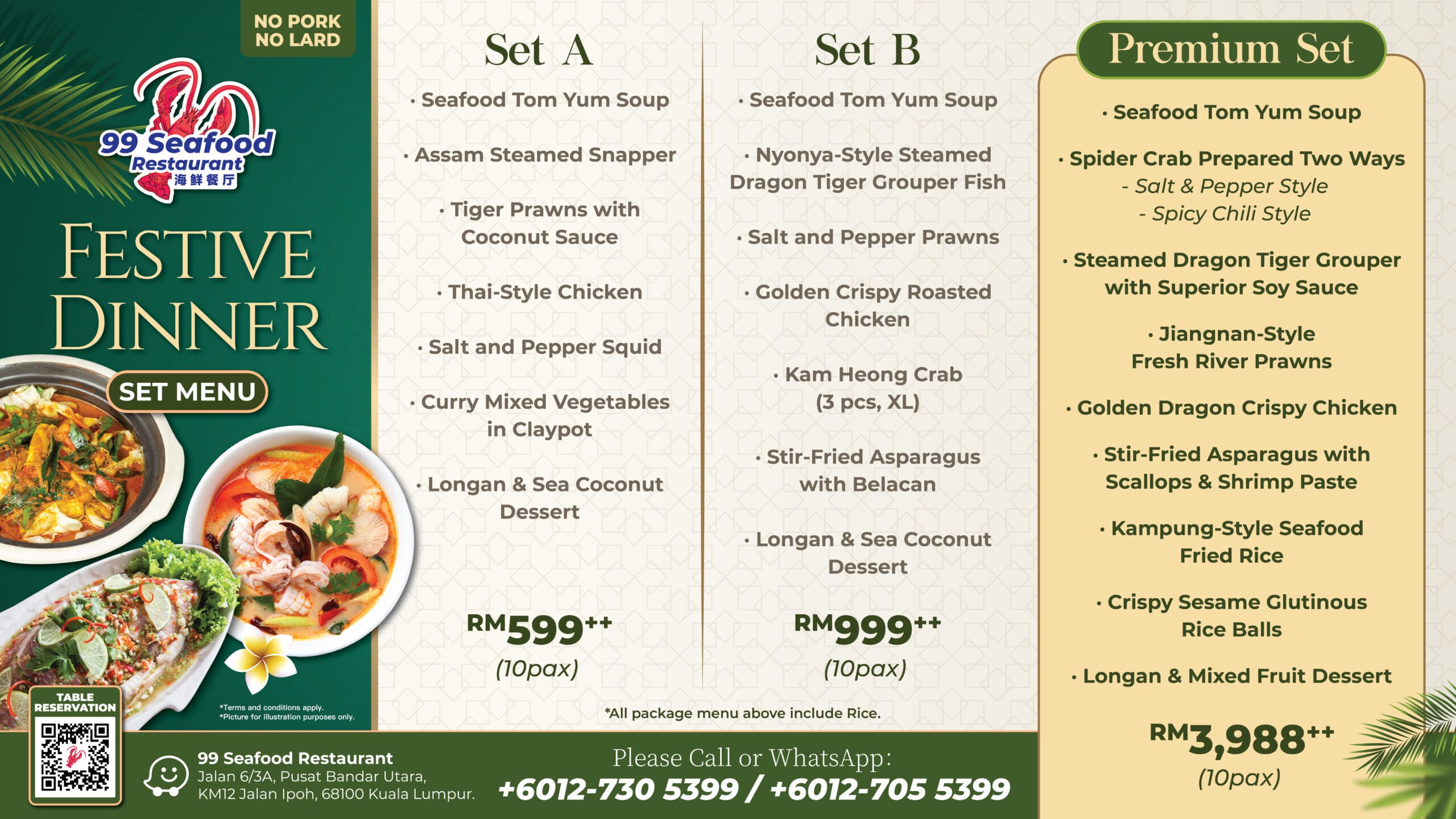 We strive to become the best seafood restaurant and make 99 Seafood Restaurant your first choice for seafood in Kuala Lumpur, Malaysia. We provide a wide variety of seafood such as Australian Lobster, Alaska King Crab, Grouper and Soon Hock Fish. View Our Menu.